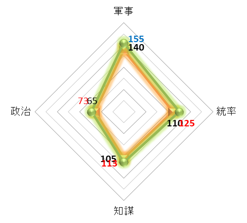 だいたいこんな感じじゃな。孫策は武官型で軍事。統率が伸びやすいタイプであることから知謀と政治の伸びは少し遅れる感じかのう。